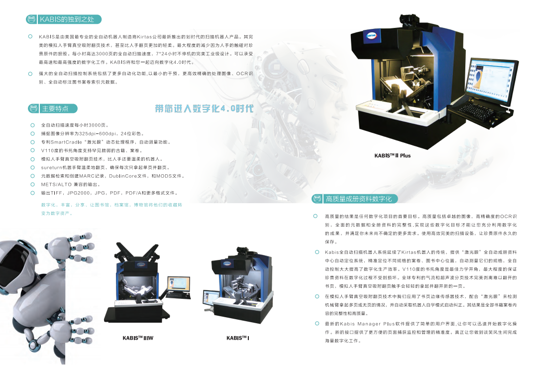 技術(shù)參數(shù):2300頁/小時,真空吸附式自動翻頁掃描機器人;掃描臺110度V型22.1兆相機X1